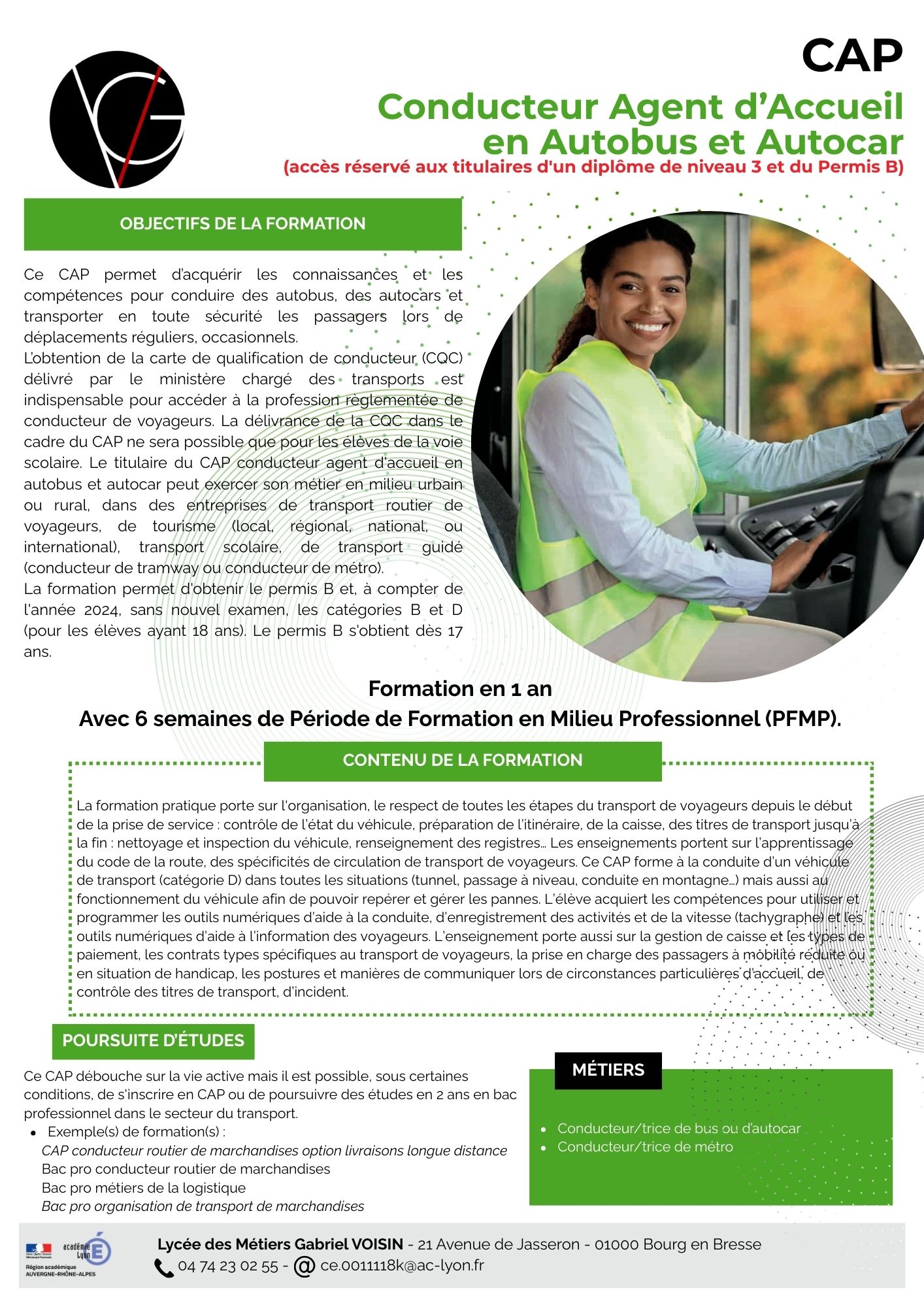 Les élèves choisissent ce CAP, après l'obtention d'un diplôme de niveau 3, s'ils veulent acquérir des connaissances et les compétences professionnelles pour conduire des autobus, des autocars et transporter en toute sécurité les passagers lors de déplacements réguliers, occasionnels.