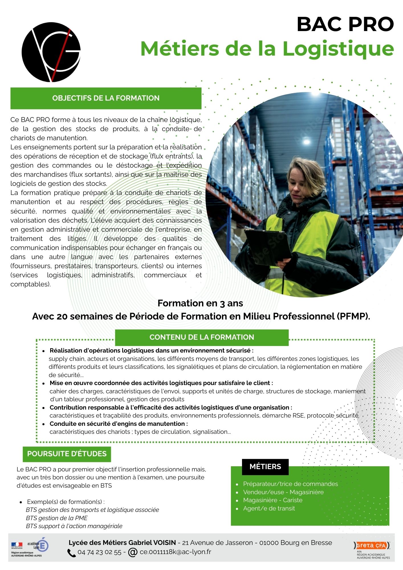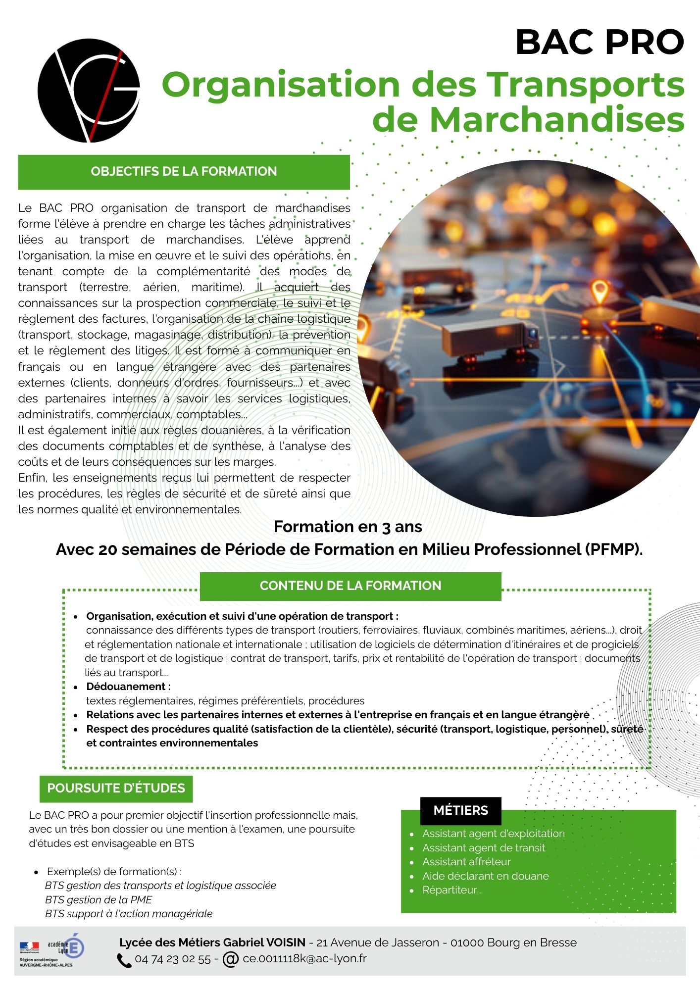 Le Lycée des Métiers Gabriel VOISIN propose dans le cadre de cette famille de métiers le BAC PRO Métiers de la Logistique et le BAC PRO Organisation de Transport de Marchandises.